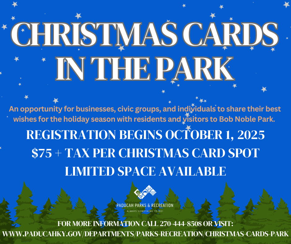 Paducah Parks and Recreation only holds 40 spaces for replica Christmas cards. To obtain a space, organizations must complete an application form and submit payment to Paducah Parks and Recreation office located inside the Robert Cherry Civic Center at 2701 Park Avenue, or email to parkinfopaducahky.gov(link sends e-mail) on or before the deadline. Each Christmas Card spot is $75 + tax. Parks & Recreation will begin accepting applications on October 1, 2025 at 8 a.m. Deadline to submit an application is October 31 at 12 p.m. However spots are limited and tend to fill up fast. Once approved, it is the responsibility of the organization to coordinate a drop off time for their Christmas Card no later than Monday, November 10, otherwise they will forfeit their reserved spot. Cards must be dropped off at the former Parks & Recreation Department Office at 1400 HC Mathis Drive.