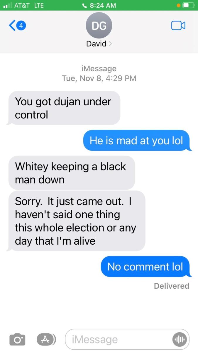 On November 8, 2022, City employees removed political signs from City-owned property that were in violation of the City’s sign ordinance. Some of the removed signs were advertising an African-American candidate for City Commissioner. Subsequent thereto, Commissioner David Guess sent a series of texts messages to a City employee wherein Commissioner Guess made the statements: “You got dujan [sic] under control” and “Whitey keeping a black man down.” See text exchange below.